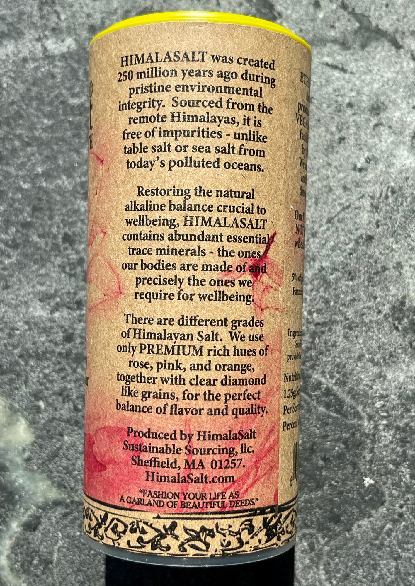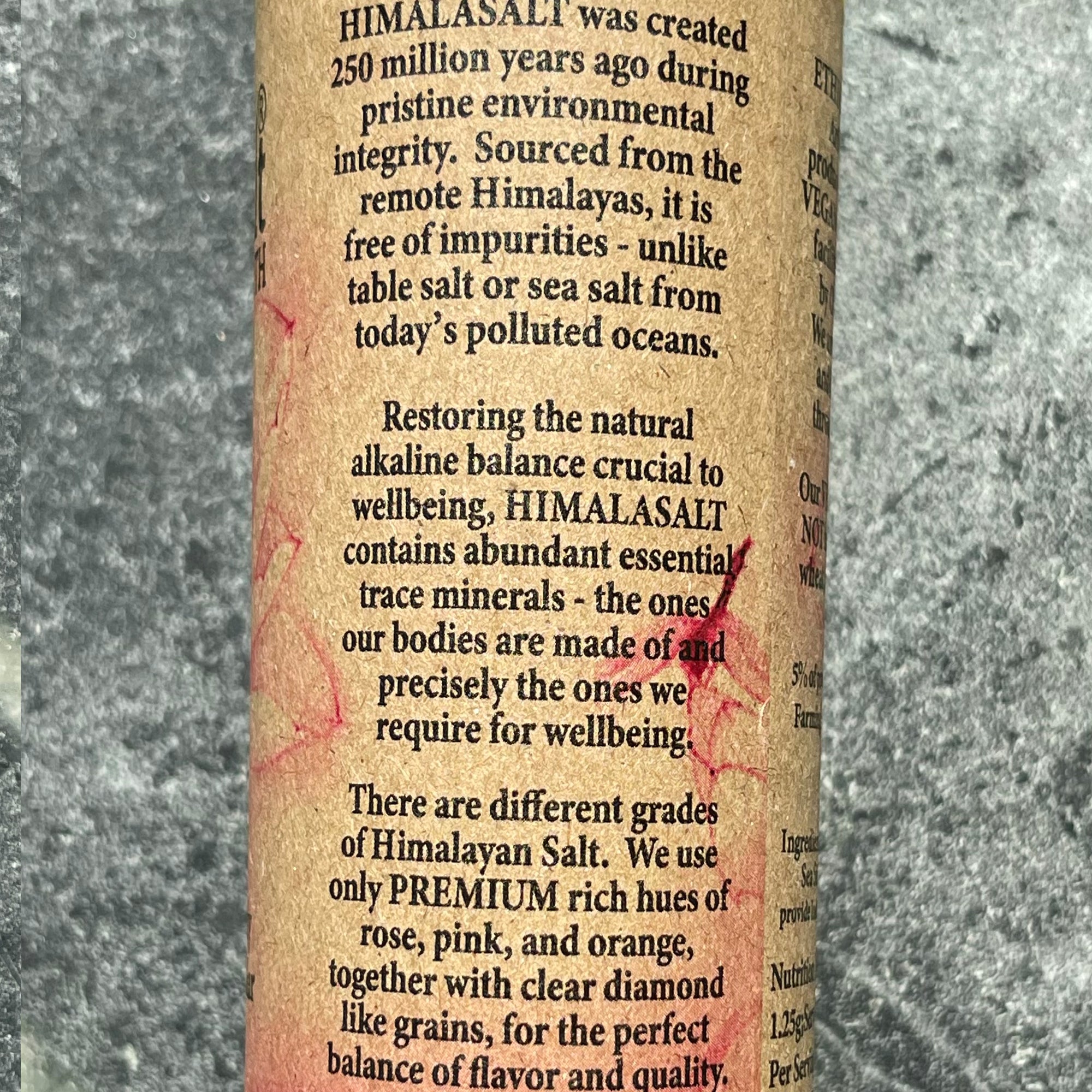 Salt is essential to life. We carry a replica of Earth's ancient ocean in our blood. HimalaSalt restores this natural alkaline balance, crucial for wellbeing. Hand-harvested and stone ground, its fresh, pure flavor, crystalline structure and gorgeous pink color stems from its naturally high content of essential minerals -- the same ones our bodies are made of, and precisely the ones we require for wellbeing.